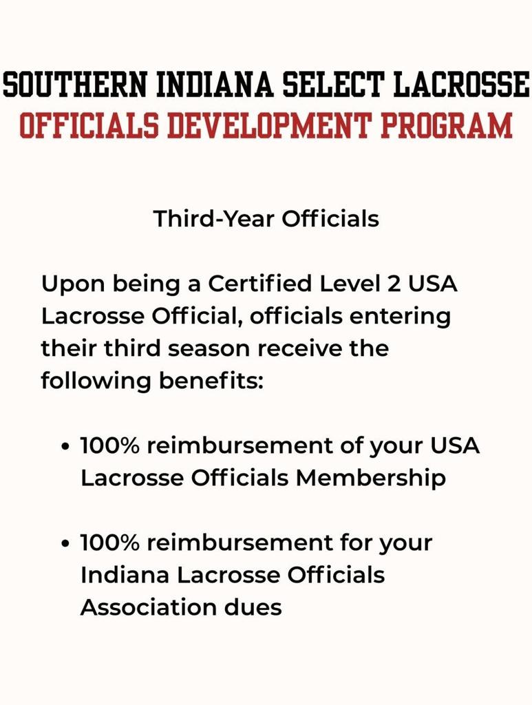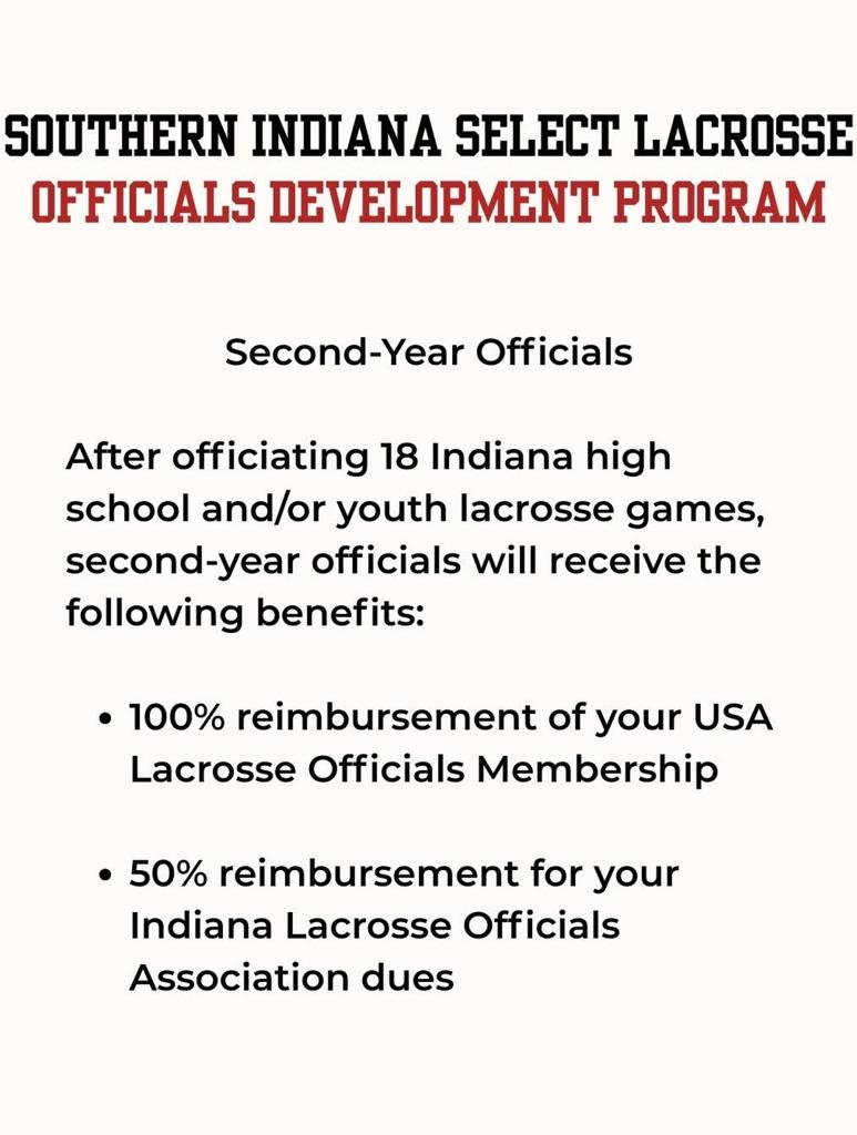 - After officiating eighteen (18) Indiana high school and/or middle school games in their 2nd season, SISL will reimburse 100% of the official’s USA Lacrosse Officials Membership for the current calendar year and 50% of the required Indiana Lacrosse Officials Association (ILOA) dues at the conclusion of the season. Receipts are required for reimbursement.