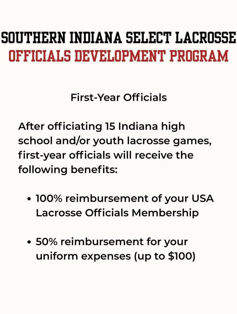 - After officiating fifteen (15) Indiana high school and/or middle school games in their 1st season, SISL will reimburse 100% of the official’s USA Lacrosse Officials Membership for the current calendar year and 50% for uniform expenses (up to $100) at the conclusion of the season. Receipts are required for reimbursement.